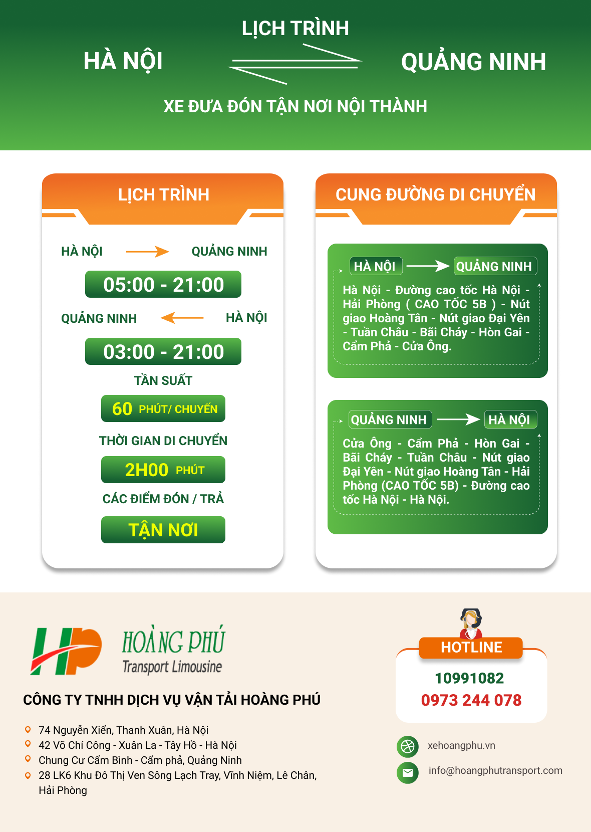 Tại Quảng Ninh: Đón/trả trung tâm TP Cẩm Phả, Hạ Long, Hòn Gai, Bãi Cháy, Bx Cửa Ông, Cảng Tuần Châu.